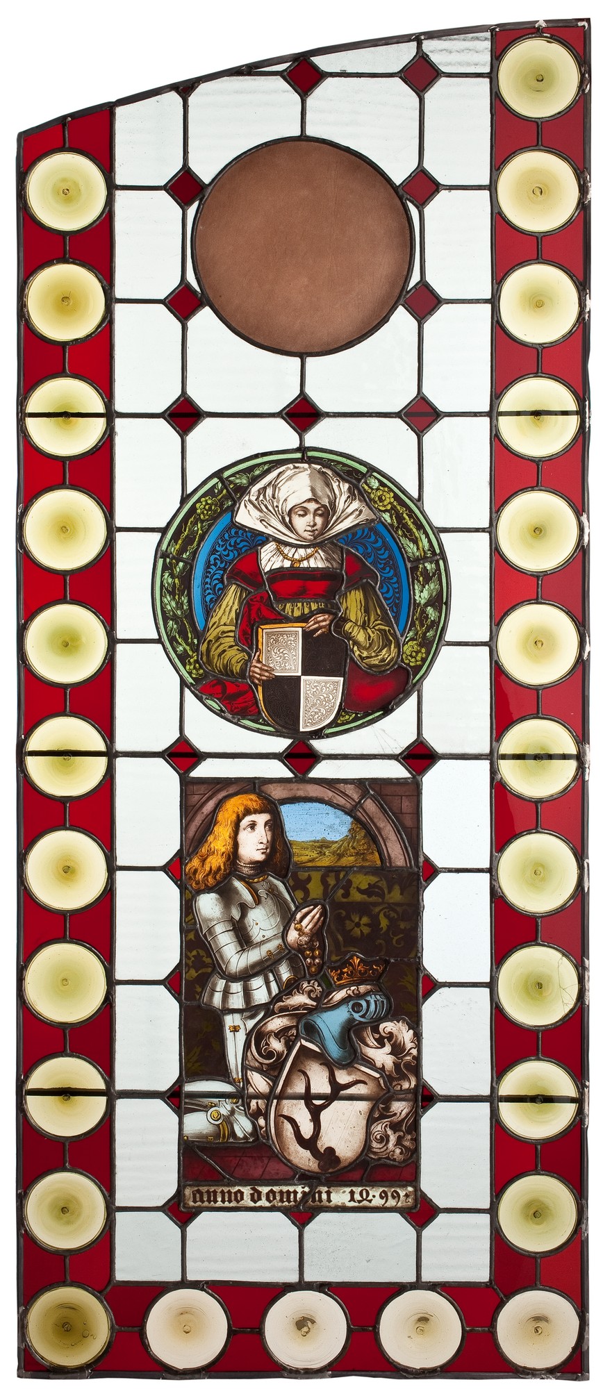 W prostokątnym polu postać klęczącego młodego mężczyzny w zbroi płytkowej. Rycerz patrzy w prawo. Jego ręce złożone w geście modlitwy, dłonie oplecione różańcem. Klęczy na tle arkady, częściowo zasłoniętej wzorzystą materią w kolorze oliwkowym. W prześwicie łuku widoczny górzysty pejzaż. Po prawej przy kolanach młodzieńca tarcza herbowa z klejnotem i labrami. W białym polu tarczy czarny jeleni róg, nad tarczą niebieski hełm, zwieńczony złotą szlachecką koroną. Zbroja lawowana patyną, szczegóły podkreślone konturówką i żółtą lazurą. Poniżej przedstawienia banderola z napisem minuskułą gotycką: anno domini 14·99.