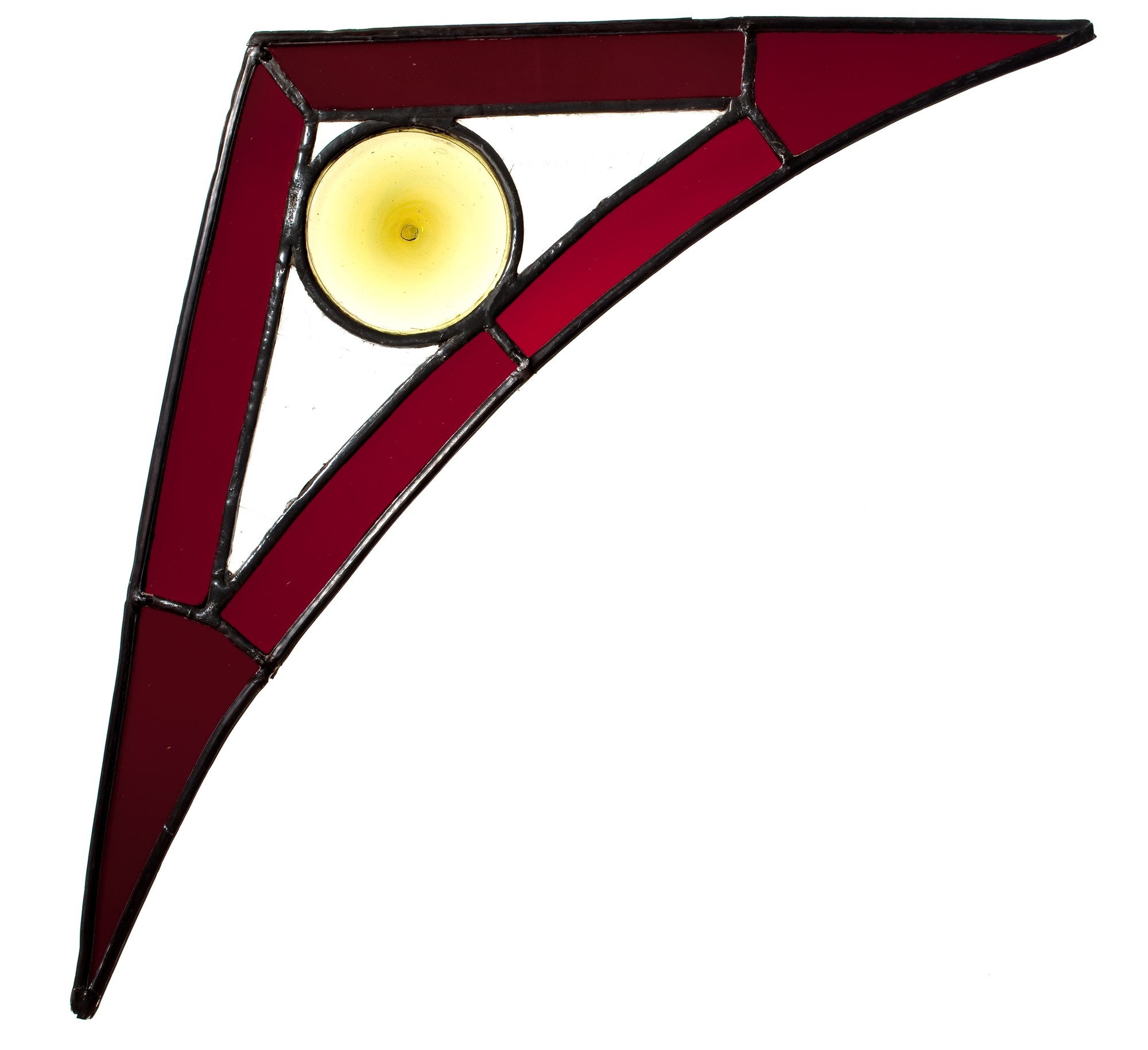 Trójkątne wypełnienie przyłucza lewego z wydłużonymi końcami i z lekko półkoliście wygiętą podstawą. Bordiura ze szkła czerwonego, wypełnienie ze szkła katedralnego bezbarwnego. W centralnej części żółte gomółki.