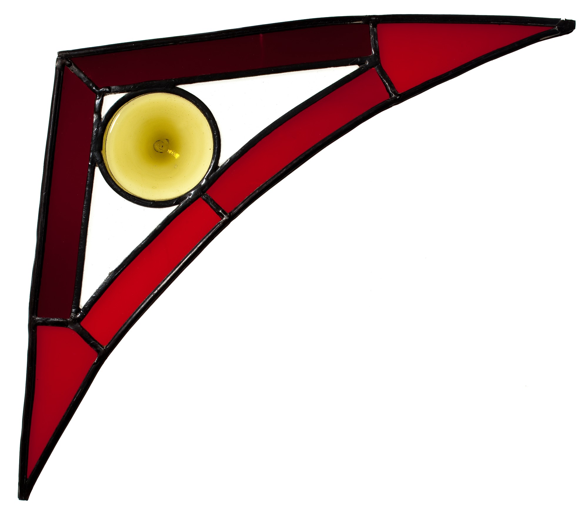 Trójkątne wypełnienie przyłucza prawego z wydłużonymi końcami i z lekko półkoliście wygiętą podstawą. Bordiura ze szkła czerwonego, wypełnienie ze szkła katedralnego bezbarwnego. W centralnej części żółte gomółki.