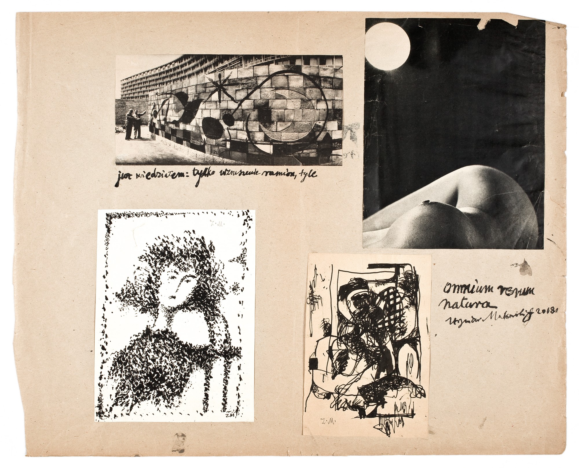 Na szarym papierze naklejone dwa rysunki i dwie fotografie. Fotografie: akt oraz mural - ściana Omnia rerum natura księżyca Joana Miro – przed budynkiem UNESCO w Paryżu.