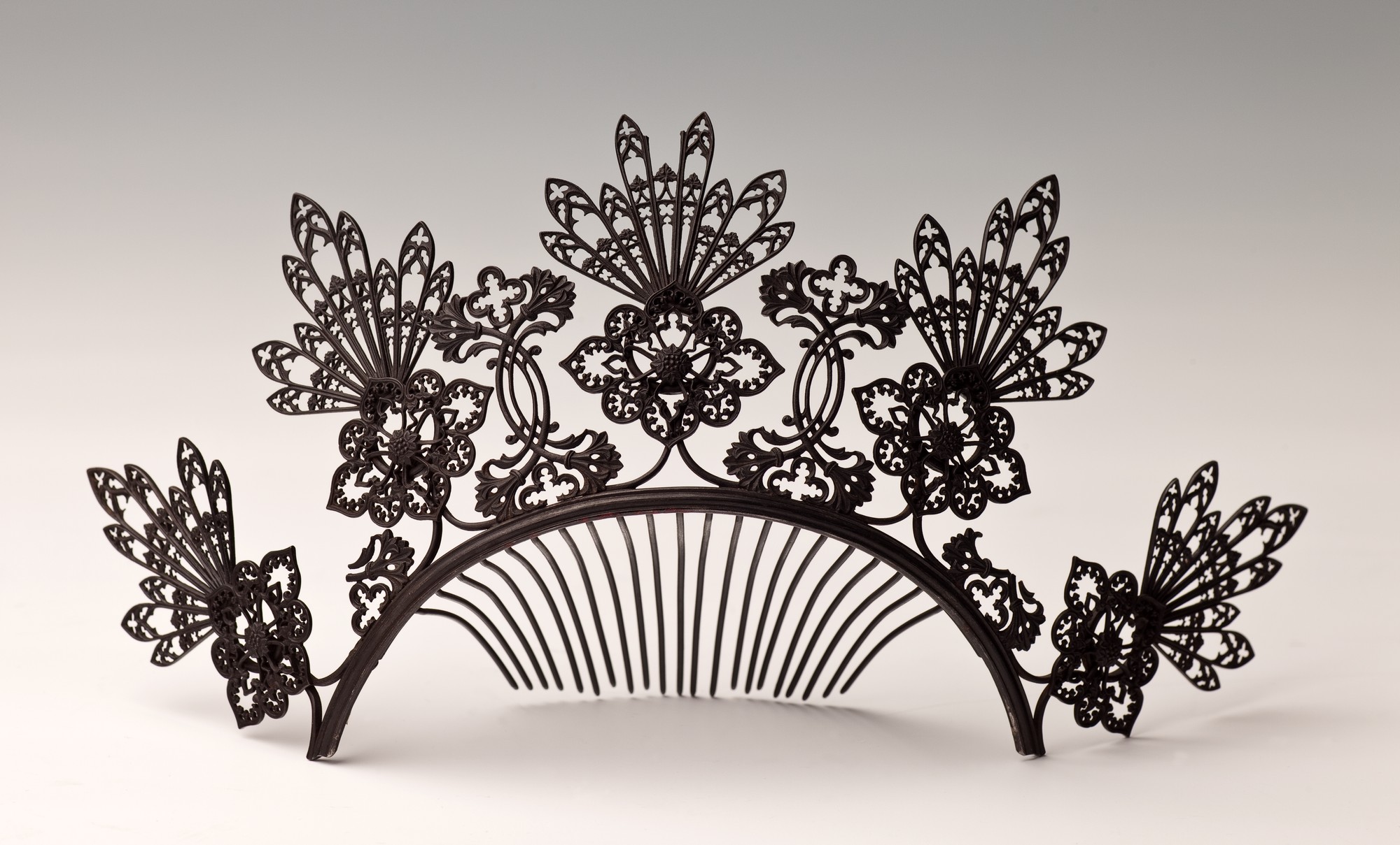 Diadem jest wyjątkowo delikatnym, niedużym wyrobem świadczącym o doprowadzeniu technologii odlewu żeliwnego do perfekcji. Misterna konstrukcja diademu związana jest z półkolistą obręczą długiego grzebienia skierowanego do wnętrza. Główną ozdoba jest pięć sterczyn w formie ażurowych siedmiolistnych rozet zwieńczonych stylizowanymi palmetami. Wnętrza tych ostatnich wypełnia neogotycki maswerk – ażurowe wypełnienie składające się z trójliści, ostrołuków i tak zwanych rybich pęcherzy wzorowanych na podziałach okien gotyckich. Stylizowane formy neogotyckie stają się modne w biżuterii i galanterii żeliwnej w latach 1820-1830.