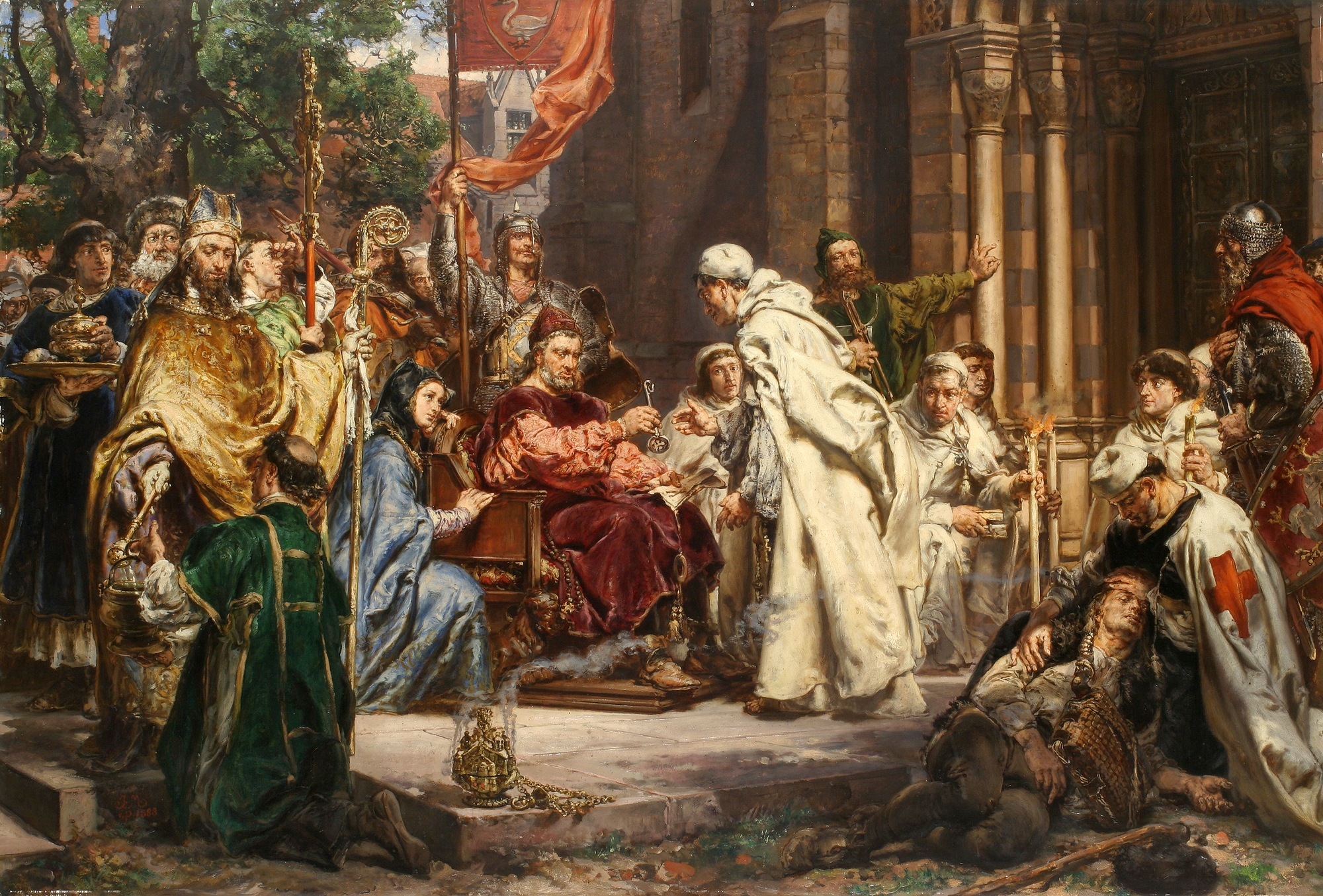 Pośrodku siedzi oślepiony Piotr Włostowic z aktem erekcyjnym w ręce i wręcza klucz do kościoła opatowi cystersów, przy nim żona Maria, księżniczka kijowska, za nim rycerz trzymający chorągiew z rodowym Łabędziem. Z lewej stoi arcybiskup gnieźnieński Jakub ze Żnina (lub jego następca Janik), z prawej, przy portalu – rycerz z rodu Gryfitów (być może Jaksa, zięć Piotra), z drugiej strony portalu widoczny budowniczy kościoła z cyrklem i węgielnicą. Na pierwszym planie z prawej templariusz klęczący przy chorym pielgrzymie.