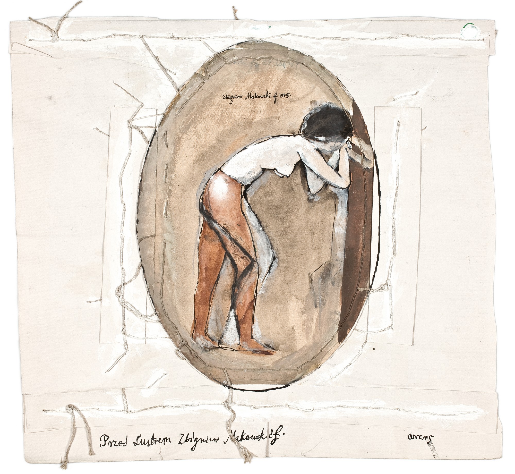 Karta z grubego brystolu, z wyciętym pośrodku owalem, następnie doszytym w tym samym miejscu. W owalu półnaga dziewczyna schylona, z podpartym rękami czolem. Widoczna korekta ustawienia nóg. Po obu stronach aplikacji naszyte wąskie paski brystolu. Podobnie - wzdłuż dolnej i górnej krawędzi.