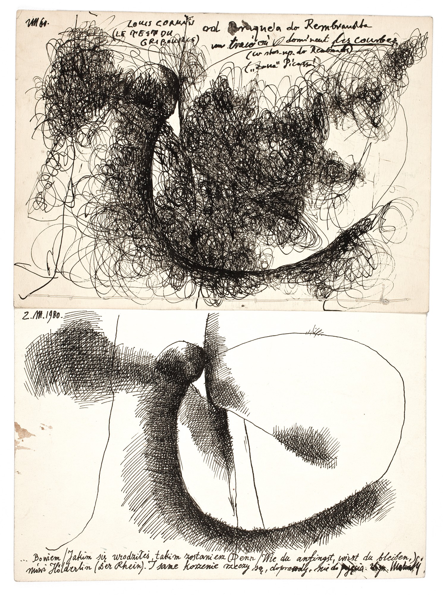 l. g.: LOUIS CORMAN / (LE TEST / DU GRIBOULLIS); obok, p.g.: od Braque'a do Rembrandta / [...] traic eu dominent les courbet / (w stos. np. do Rembrandta) / ("Żona" Picassa); d.: Bowiem / Jakim się urodziłeś, takim zostaniesz (Denn / Wie du anfingst, wirst du bleiben) / mowi Holderlin (Der Rhein). I same korzenie rzeczy są, doprawdy, nie do pojęcia. Zbign. Makowski.