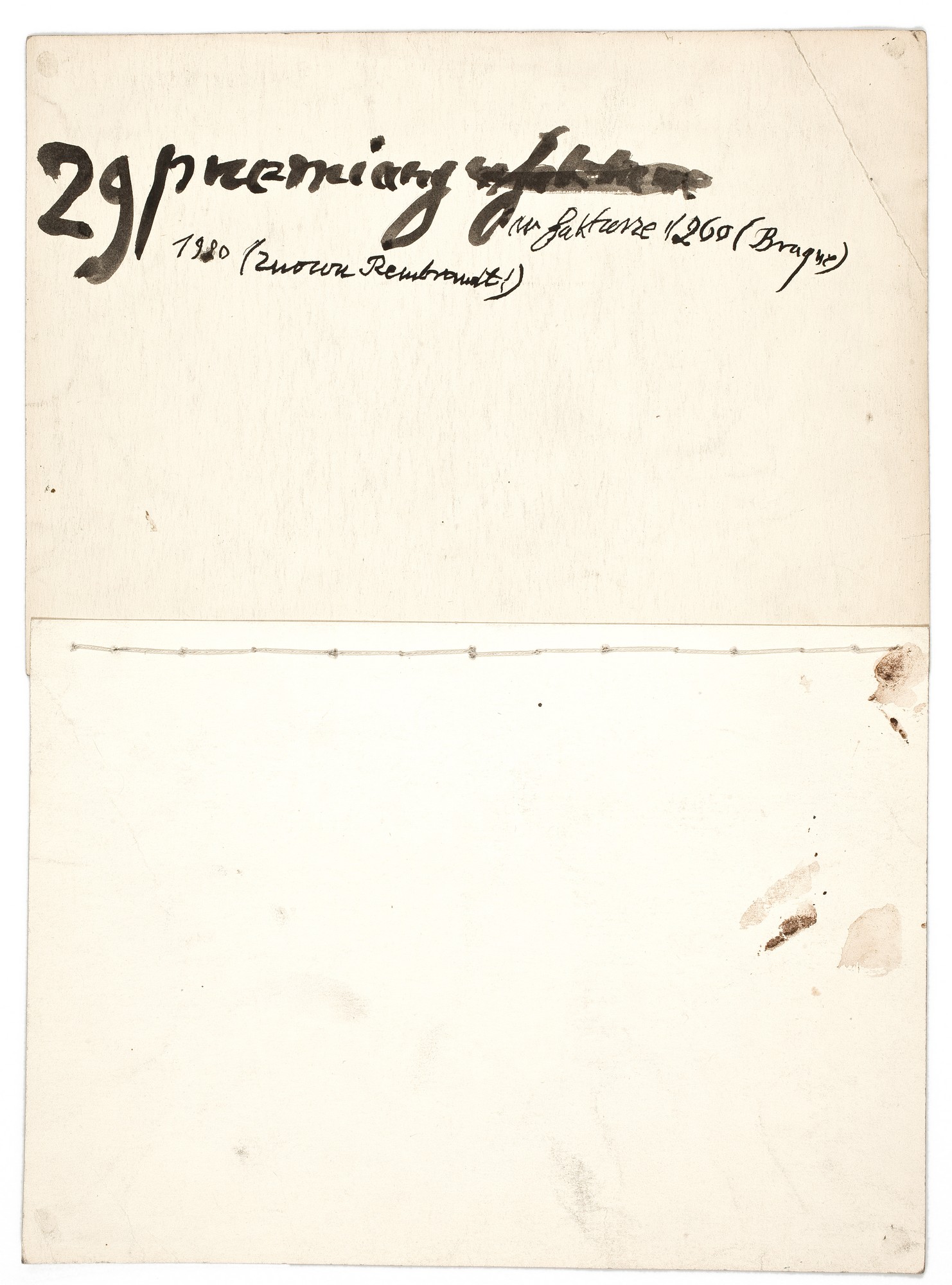 Dwie zszyte ze sobą karty brystolu. Na górnej - motyw owalu wśród esów-floresów. Na dolnej podobny motyw, bardziej uporządkowany, ze sztrafunkiem.