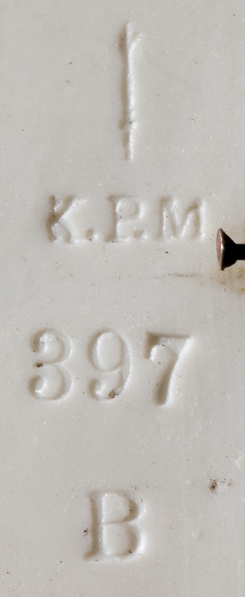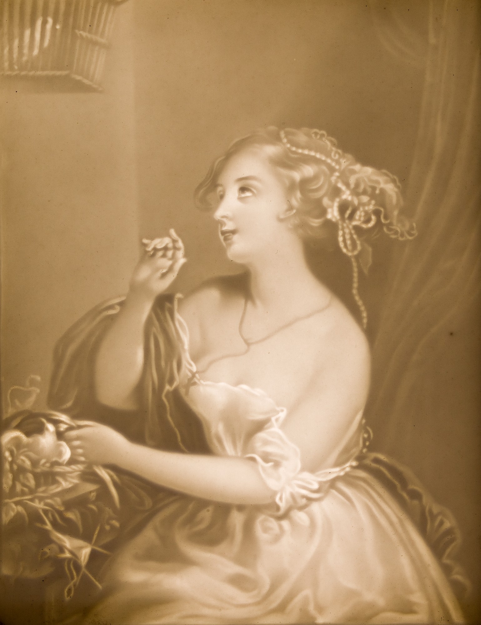 Prostokątna płyta z dekoracją w technice litofanii: półpostaciowe przedstawienie siedzącej dziewczyny, trzymającej koszyk z gołębiem, drugą wskazuje na zawieszoną klatkę z ptakiem.