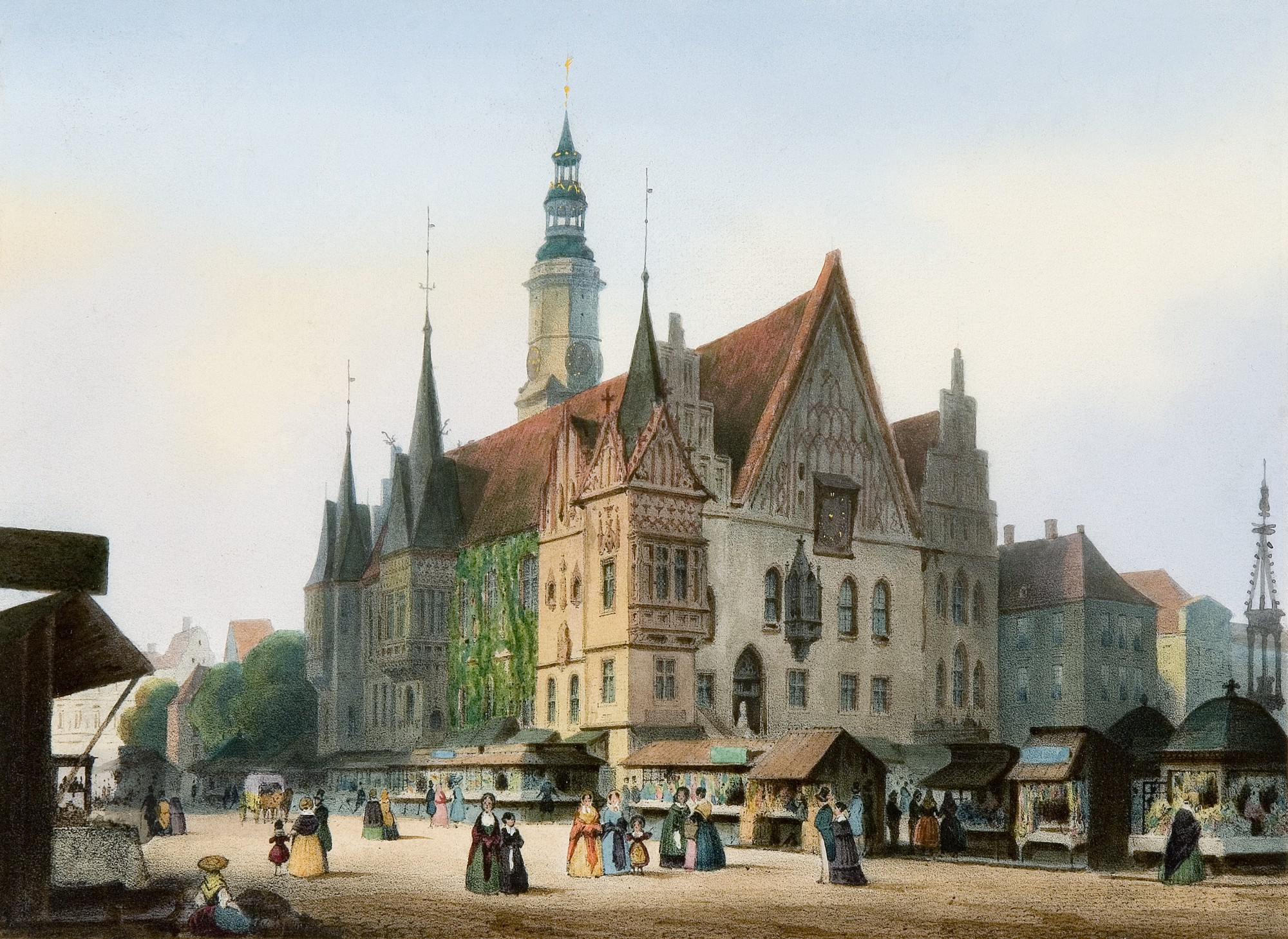 Przed wschodnią fasadą ratusza i wzdłuż jego południowej elewacji, a także po południowej stronie Rynku (lewy dolny narożnik) liczne kramy i kioski, przy których gromadzą się kupujący. Przy prawej krawędzi ryciny pręgierz. Nad niewidocznym wejściem do Piwnicy Świdnickiej elewacja porośnięta dzikim winem. Za ratuszem po lewej, wśród drzew o kulistych koronach (choć wiadomo, że od 1793 roku rosły tu topole włoskie) budynek odwachu (zbyt wysoki w stosunku do rzeczywistości). Na prawo od ratusza widoczne domy klasycystycznej zabudowy w miejscu dawnych Sukiennic. Kolorystyka stonowana z barwnymi akcentami strojów przechadzających się ludzi, zwłaszcza kobiet.