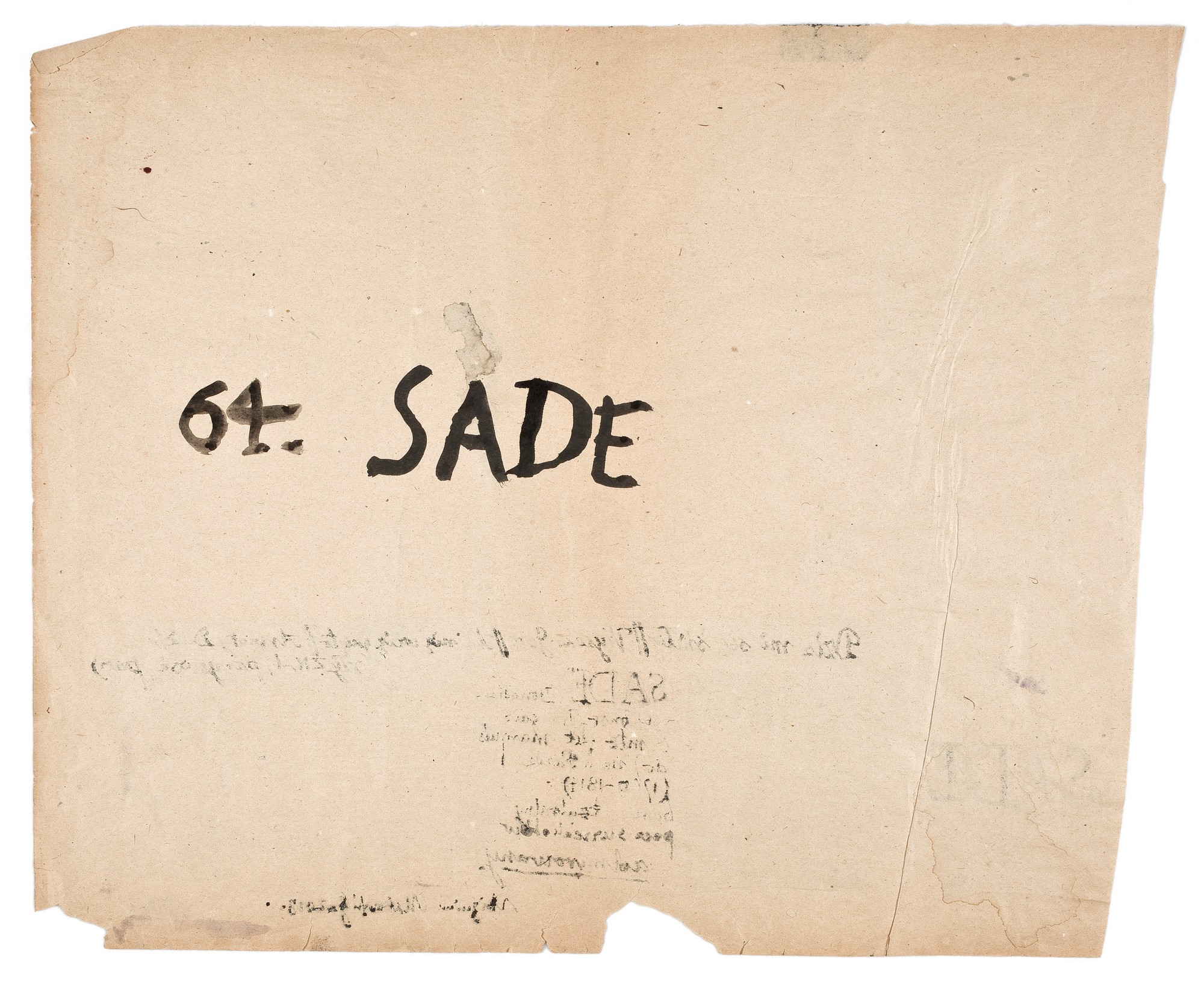 tuszem, na srodkowym rysunku, u góry, l.d.: SO / CUL / UM; na szarym papierze tuszem, l.d.: SADE; pomiędzy rysunkami górnymi i dolnymi: Dziś mi się śniła // Wysoka Góra // Na nią wciągnięto // Armaty dwie // / (zły ZNAK, parzystość, par) / SADE (Donatien / Alphonse Francois / comte die marquis / de) ne a'Paris / (1740-1814) / bardzo teatralny / prze surrealistów / admirowany. Na odwrocie, l. sr. : 64 SADE