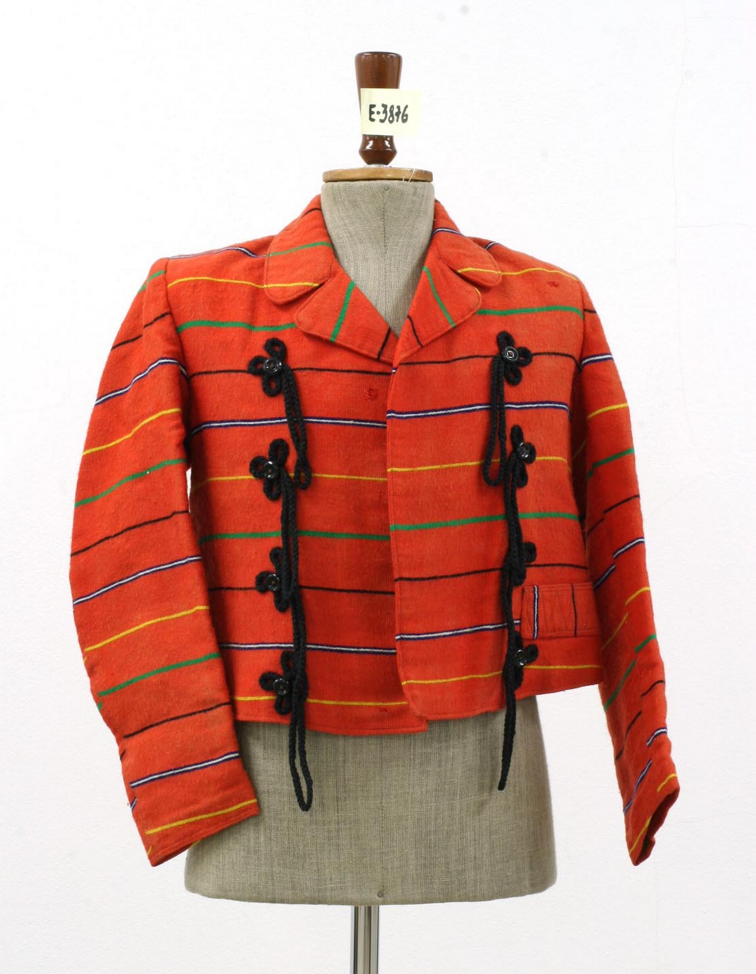 Spencerek chłopięcy z tkaniny wełnianej (osnowa lniana) o splocie rypsu – na czerwonym tle poziome prążki w kolorach: żółtym, zielonym, czarnym, ciemnoniebieskim i białym; podszewka z szarego płótna lnianego, watowanie na ramionach.