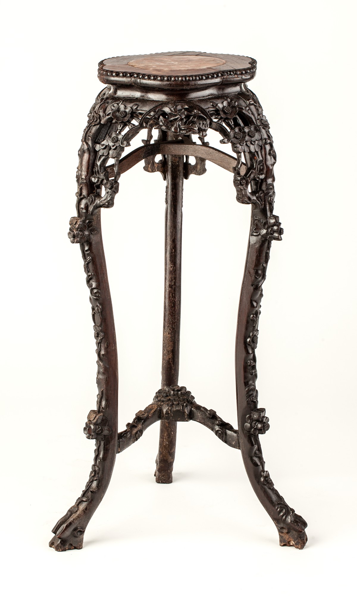 Nogi stolika zakończone stopami stylizowanych kopytek, dekorowane od strony zewnętrznej płaskorzeźbionymi wielopłatkowymi kwiatami, a na kolanach nóg i pomiędzy kolanami – pękami tych kwiatów i wicią roślinną. Nogi u dołu zespolone łączyną trójwidlastą, zdobioną na ramionach rzeźbionymi kwiatami, a w miejscu przecięcia rozetą. Na wysokości dwóch trzecich nogi przewiązane są powtórnie – łączyną angielską typu isle of Man stretcher, z użyciem trzech prostych listewek. Blat z szerokim falistym brzegiem dekorowanym ornamentem perełkowym, z umieszczonym centralnie kolistym polem wyłożonym marmurem.