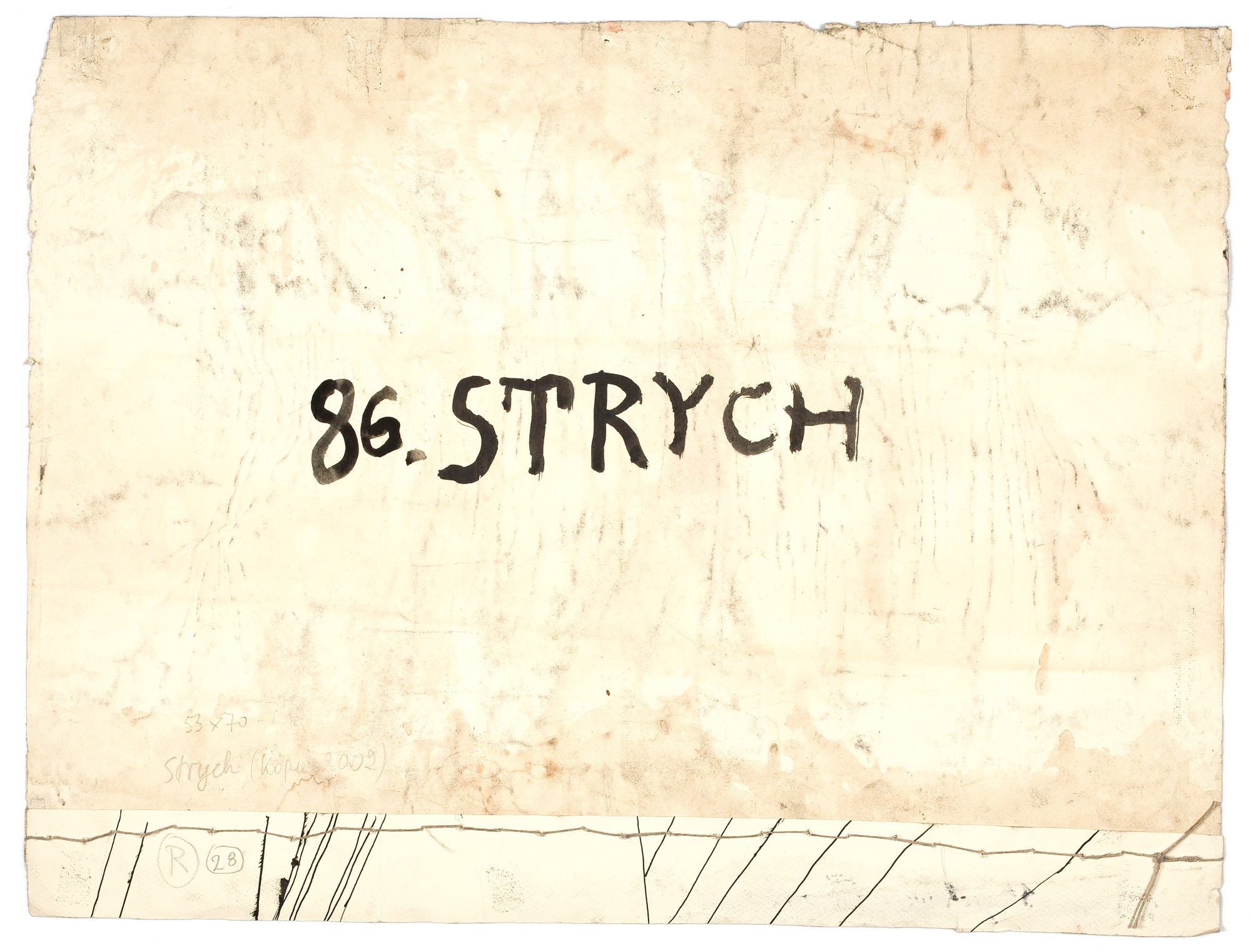 ołówkiem, p.d.: Strych we Fromborku; tuszem, na doszytym pasku, l.d.: Strych we Fromborku; tuszem, wzdłuż lewej krawędzi rysunku: What reinforcement we may gain from hope, If not, what resolution from despair". John Milton PARADISE LOST . Book I, 190-91; Tuszem na odwrocie, pośr.: 86. STRYCH; ołówkiem, l.d.: 53 x 70 / Strych (kopia 2002)