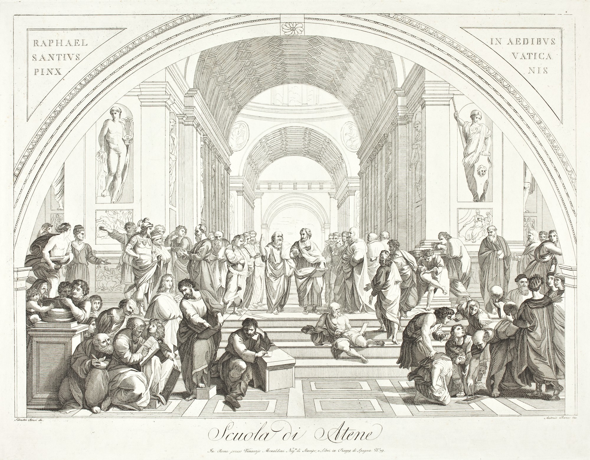 u dołu pośrodku: Scuola di Atene / In Roma presso Venanzio Monaldini Neg.te di Stampe, e Libri in Piazza di Spagna N.o 79.;