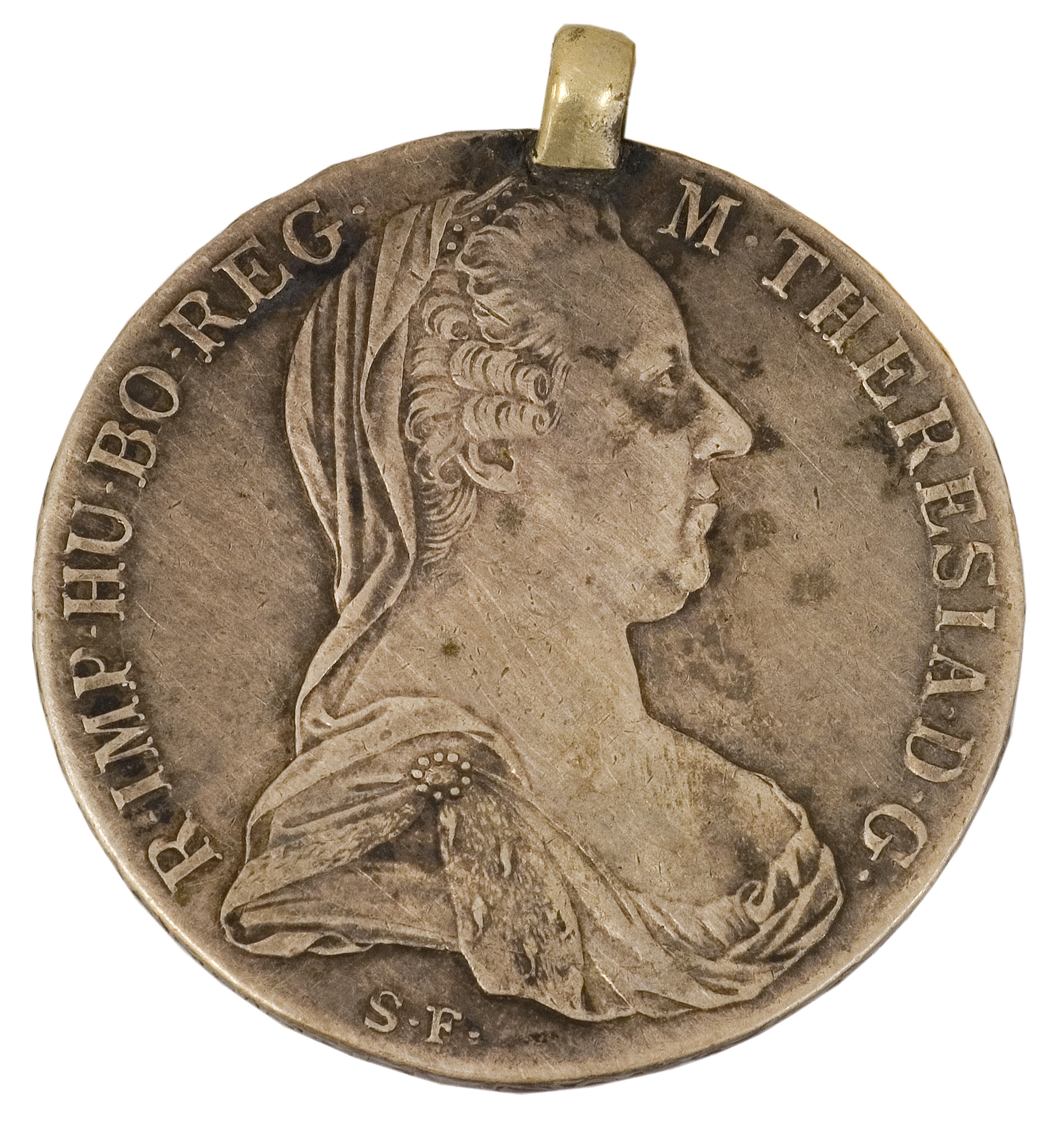 Srebrna moneta do naszyjnika. Na rewersie wizerunek Marii Teresy (popiersie z profilu) i napis przy brzegu: M. THERESIA D. G. R. IMP. HU. BO. REG, a na dole mniejsze literki S.F. Na awersie dwugłowy orzeł w koronie z herbem pośrodku oraz napis przy brzegu: ARCHID. AVST. DUX BURG. CO. TYR. 1780 X.