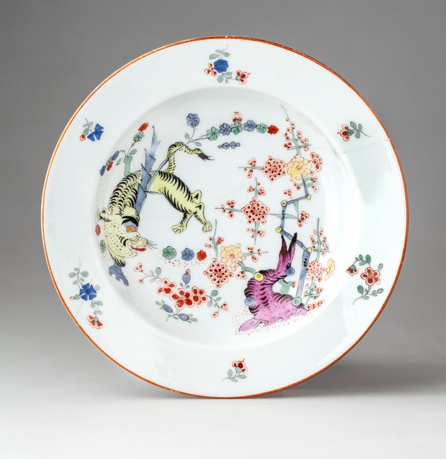 Talerz głęboki. Dekoracja barwnie malowana: w lustrze przedstawienie lwa owiniętego wokół bambusowego pnia, na kołnierzu pojedyncze gałązki indyjskich kwiatów. Kolory: żółcień, cynober, zieleń, niebieski, fiolet, brąz. Krawędź kołnierza obrzeżona cynobrem.