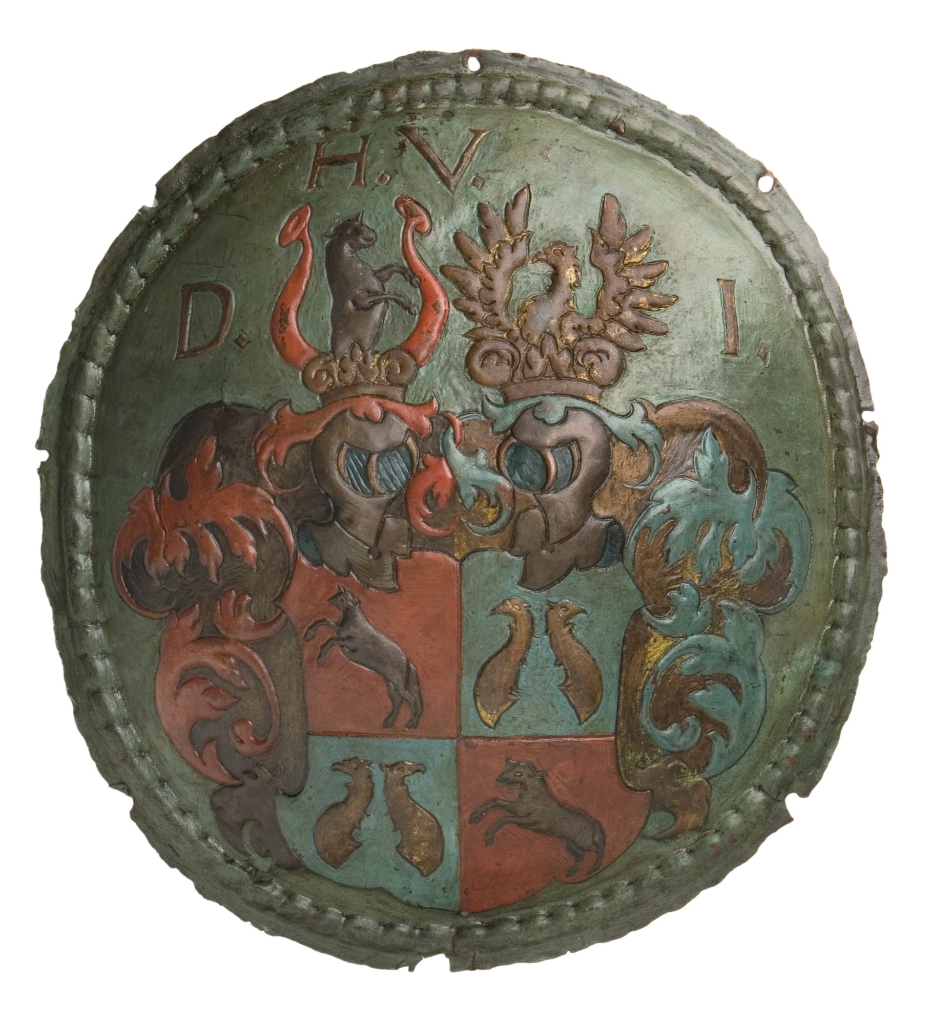 Tarcza owalna wycięta i wyrepusowana w blasze miedzianej, malowana na zielono, obramowana półwałkiem poprzecznie karbowanym, w formie wieńca laurowego, zewnętrzna krawędź prosta, w niej oraz w polu tarczy ok. dziesięć okrągłych otworów montażowych oryginalnych i wtónych. Tarcza herbowa czwórdzielna w krzyż, w 1.i 4. czerwonym polu srebrna (?) owca (?) wspięta, w prawo; w błękitnych polach 2. i 3. dwa złote (?) orle korpusy (bez skrzydeł) z głowami odwróconymi od siebie. Nad tarczą 2. hełmy w złotych koronach, w klejnocie nad pierwszym pół srebrnej ? owcy w skoku, w lewo pomiędzy dwoma bawolimi czerwonymi rogami, w klejnocie nad hełmem, po lewej, pół złoty orzeł z rozłożonymi skrzydłami, głową w prawo. Ponad klejnotem złote litery D. H. V. I. Labry z prawej strony czerwono-złote (srebrne ?), z lewej strony błękitno-złote.