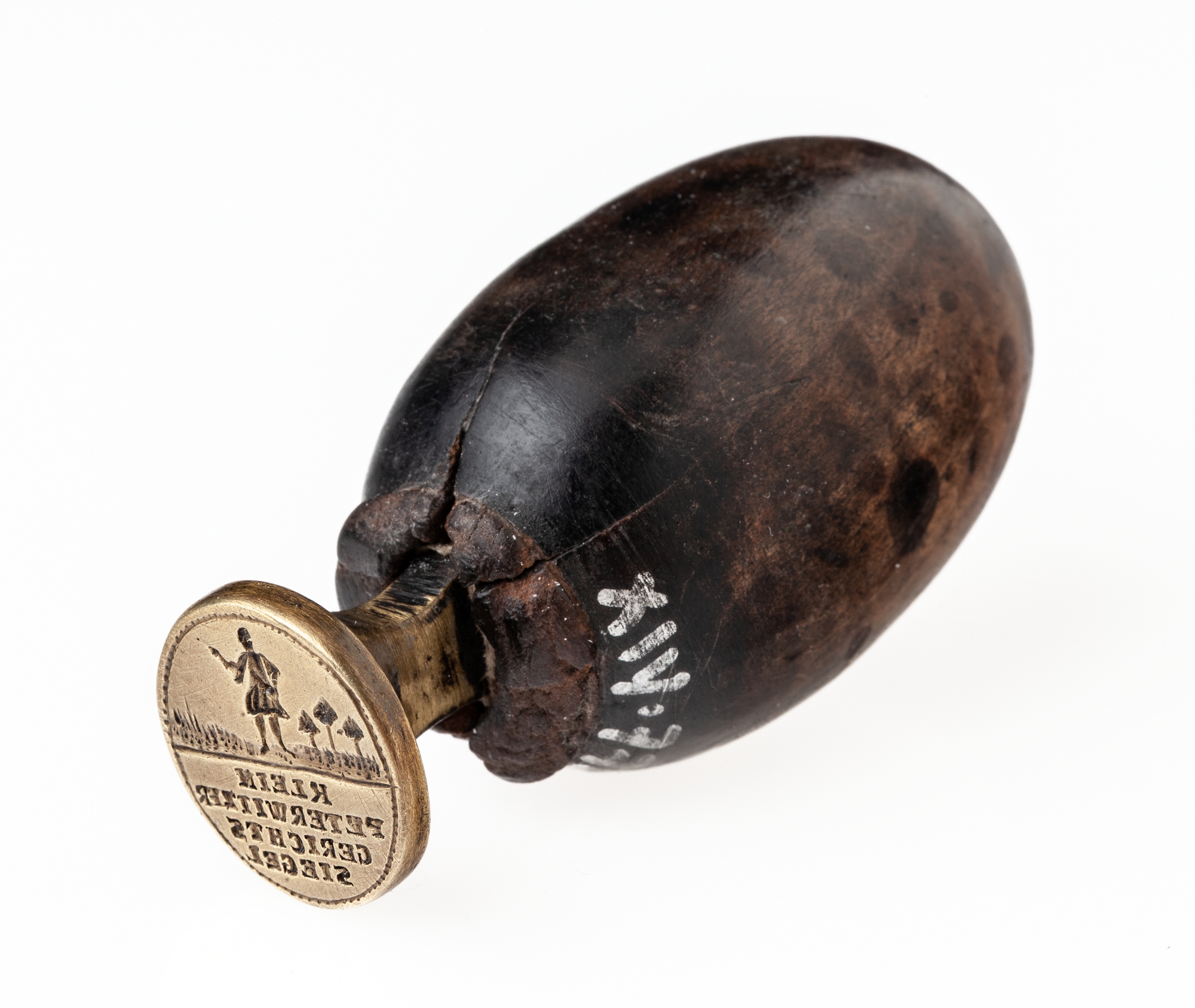 Mosiężna matryca tłoka z profilowaną płytką mocującą na odwrociu osadzona została w drewnianym uchwycie przypominającym swoim kształtem wydłużone jajko. Pole napieczętne owalnego lica matrycy obwiedziono pojedynczym otokiem liniowo-perełkowym i podzielono dwudzielnie w pas na dwie równe części. W polu części górnej przedstawiony został en face mężczyzna siejący w polu zboże. W tle z prawej strony ( na odcisku pieczętnym będzie z lewej) widoczne są trzy drzewa iglaste. W części dolnej znajduje się odwrócony napis wykonany kapitałą: KLEIN / PETERWITZER / GERICHTS / SIEGEL.