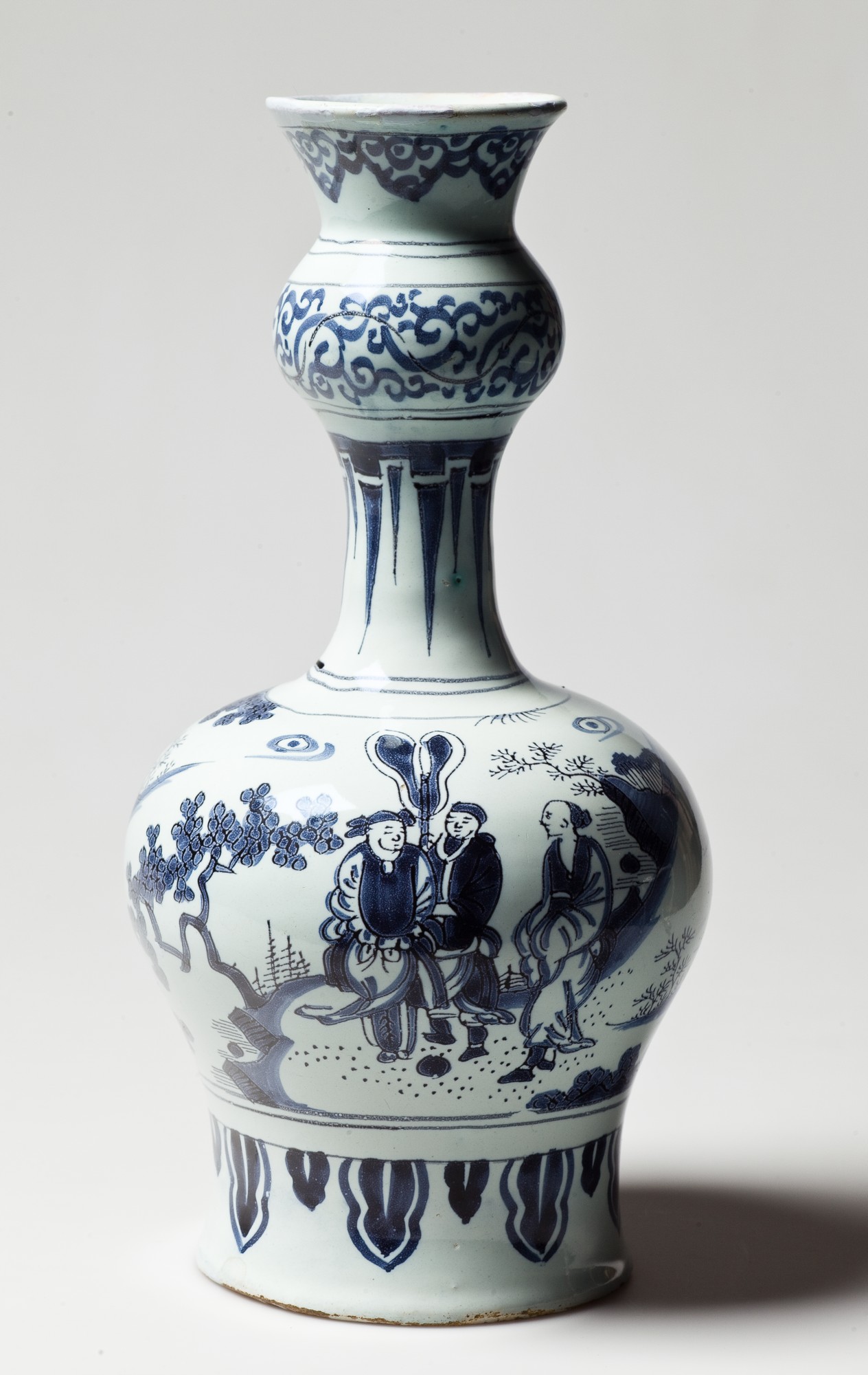 Wazon o kształcie tykwowym; stopa cylindryczna; wylew rozchylony. Malatury kobaltowe, miejscami konturowane (trek); punktowe zielone ślady zanieczyszczeń szkliwa tlenkiem żelaza. Na brzuścu, w układzie kontynuacyjnym, trzy sceny z chińskimi dostojnikami na tle uproszczonego pejzażu; na stopie – fryz lancetowatych trójliści, na szyi – wydłużonych trójkątów; na nodusie wić podobna do motywu karakusa, wokół wylewu bordiura z elementów w typie berło ruyi.