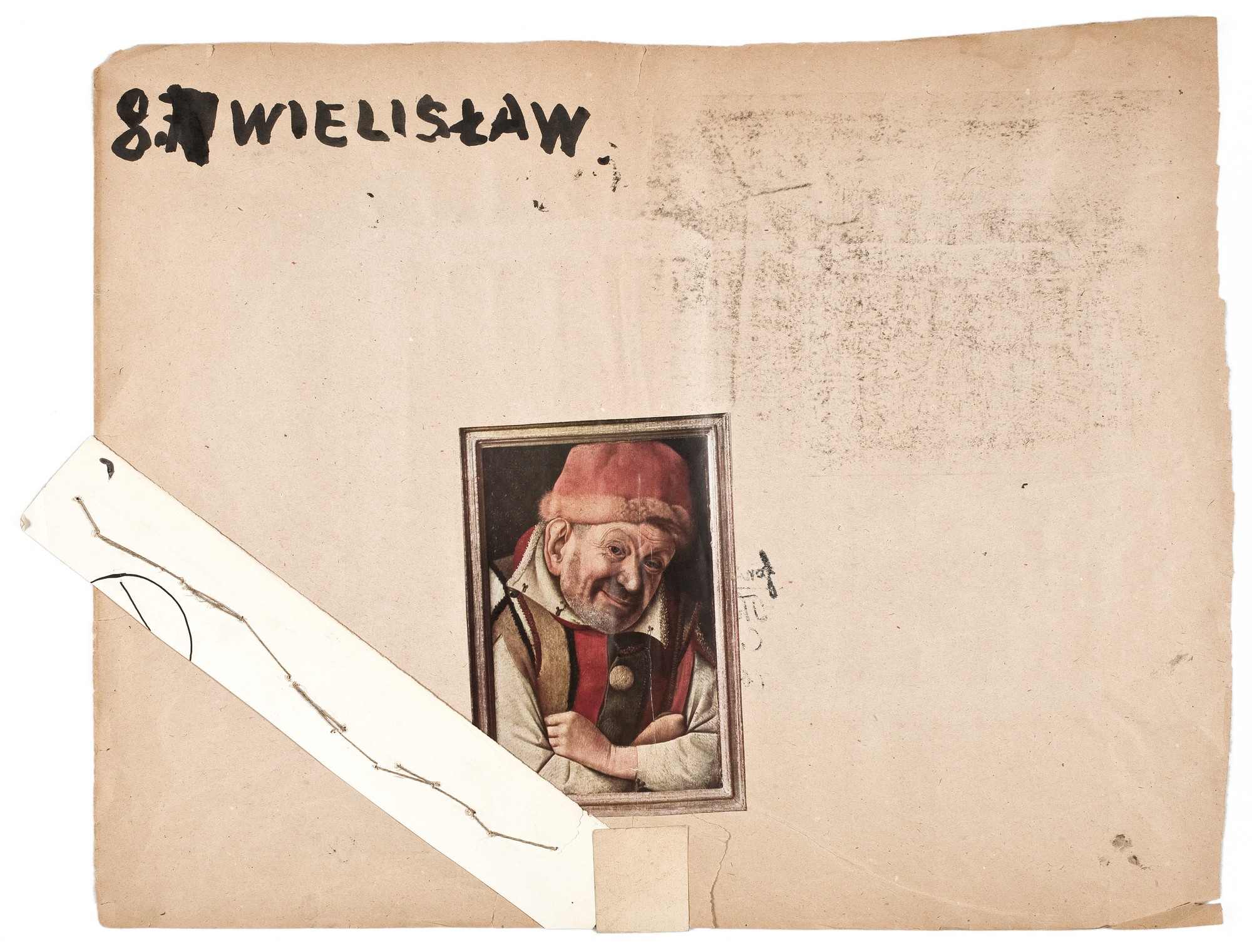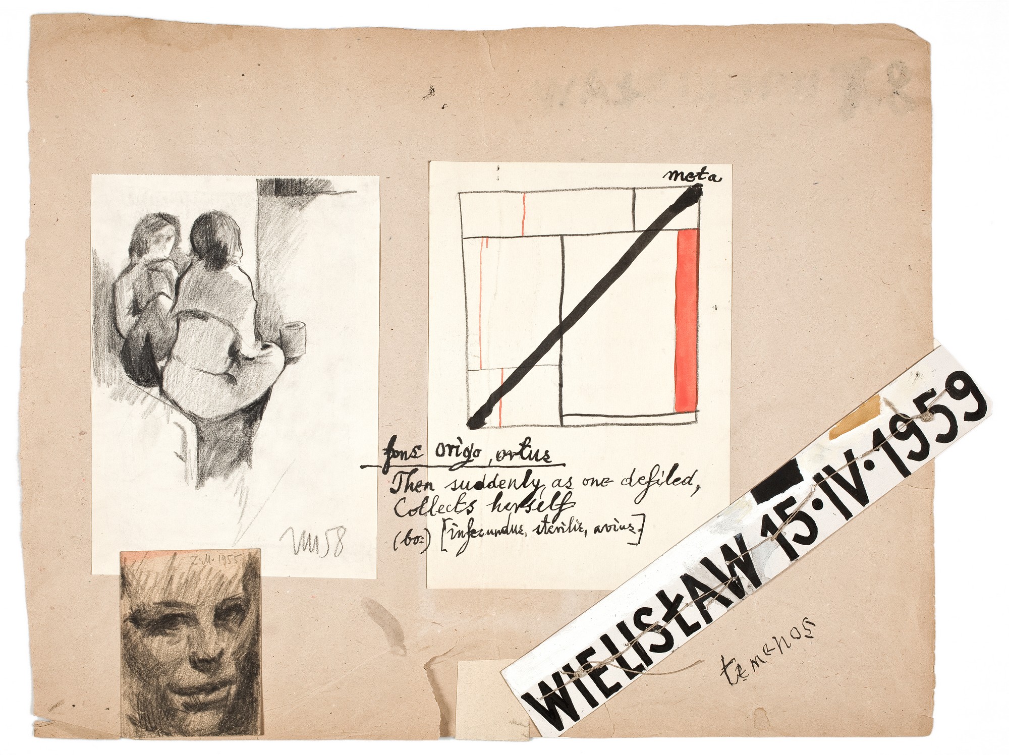 Arkusz szarego papiueru z naklejonymi trzema rysunkami i jedną reprodukcją oraz z przyszytym napisem. Po stronie lewej rysunek czarnym ołówkiem przedstawiający dwie siedzące, rozmawiające ze sobą kobiety (jedna - odwrócona tyłem). Niżej - autoportret (twarz) rysowany ołówkiem. Pośrodku - rysunek w duchu Mondriana. W prawym dolnym rogu - ukośnie przyszyty dratwą pasek brystolu, z napisem wykonanym tuszem dużymi drukowanymi literami. Na odwrocie - barwna reprodukcja renesansowego (malarstwo północne) portretu starszego, uśmiechniętego mężczyzny.
