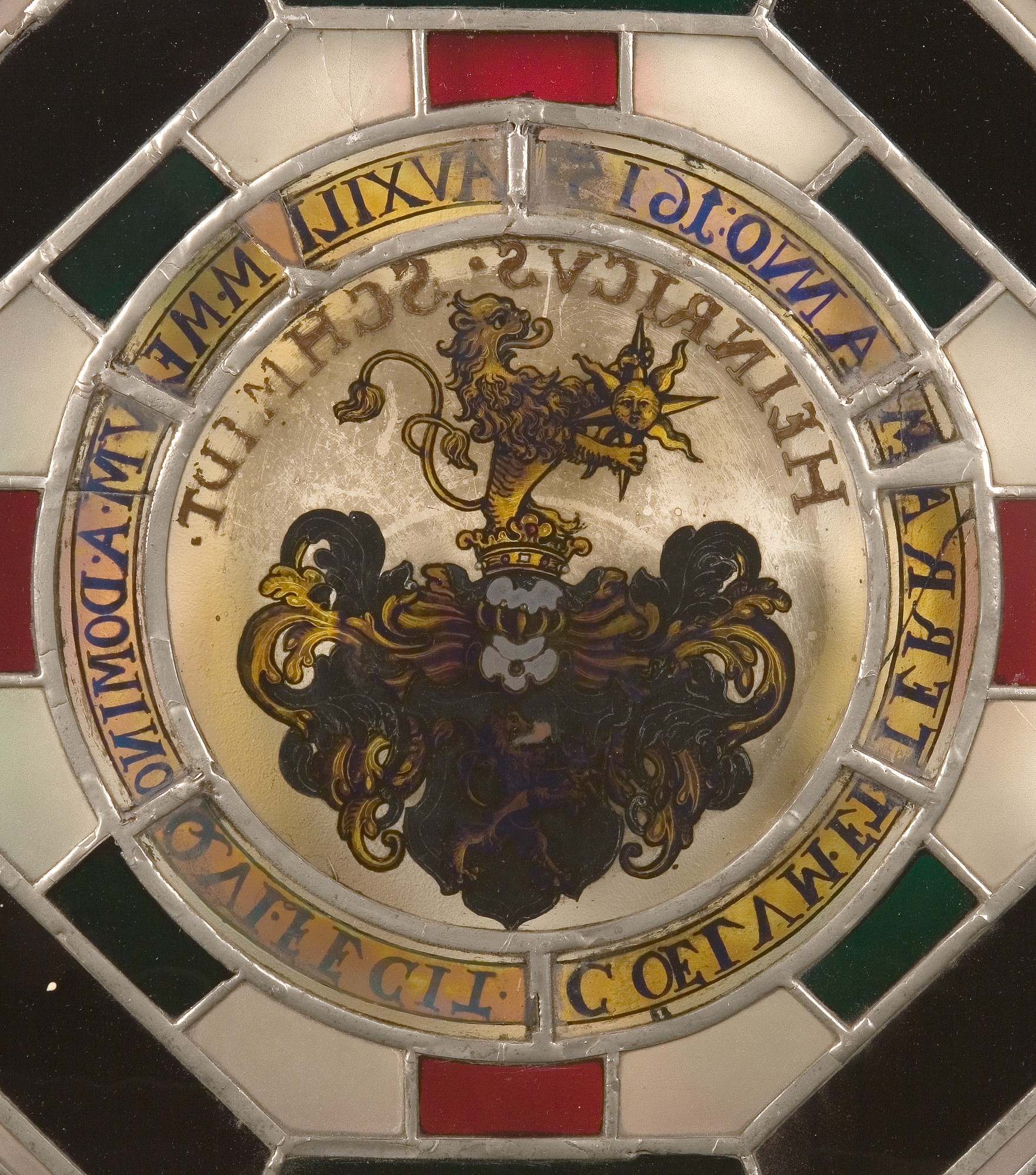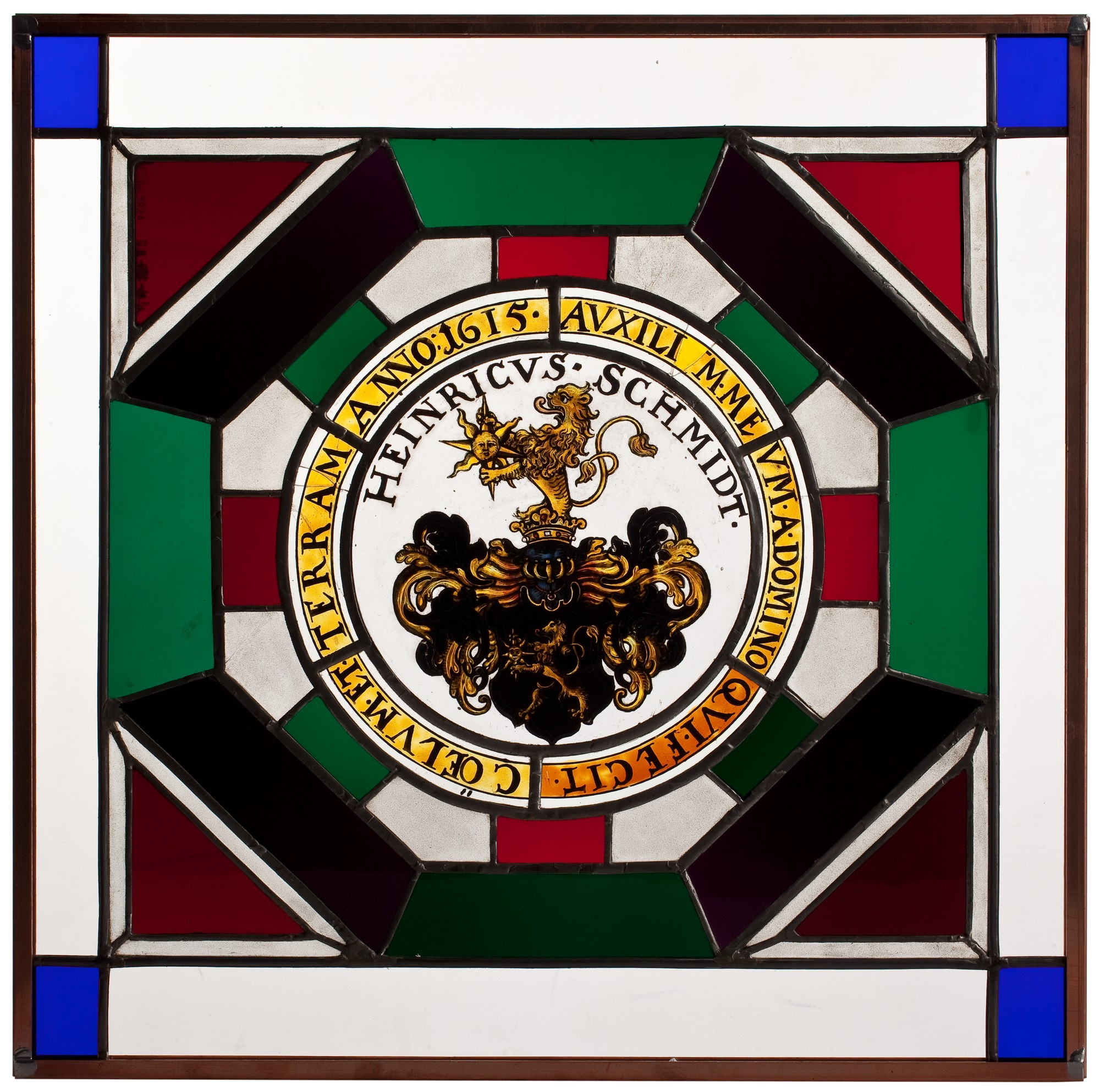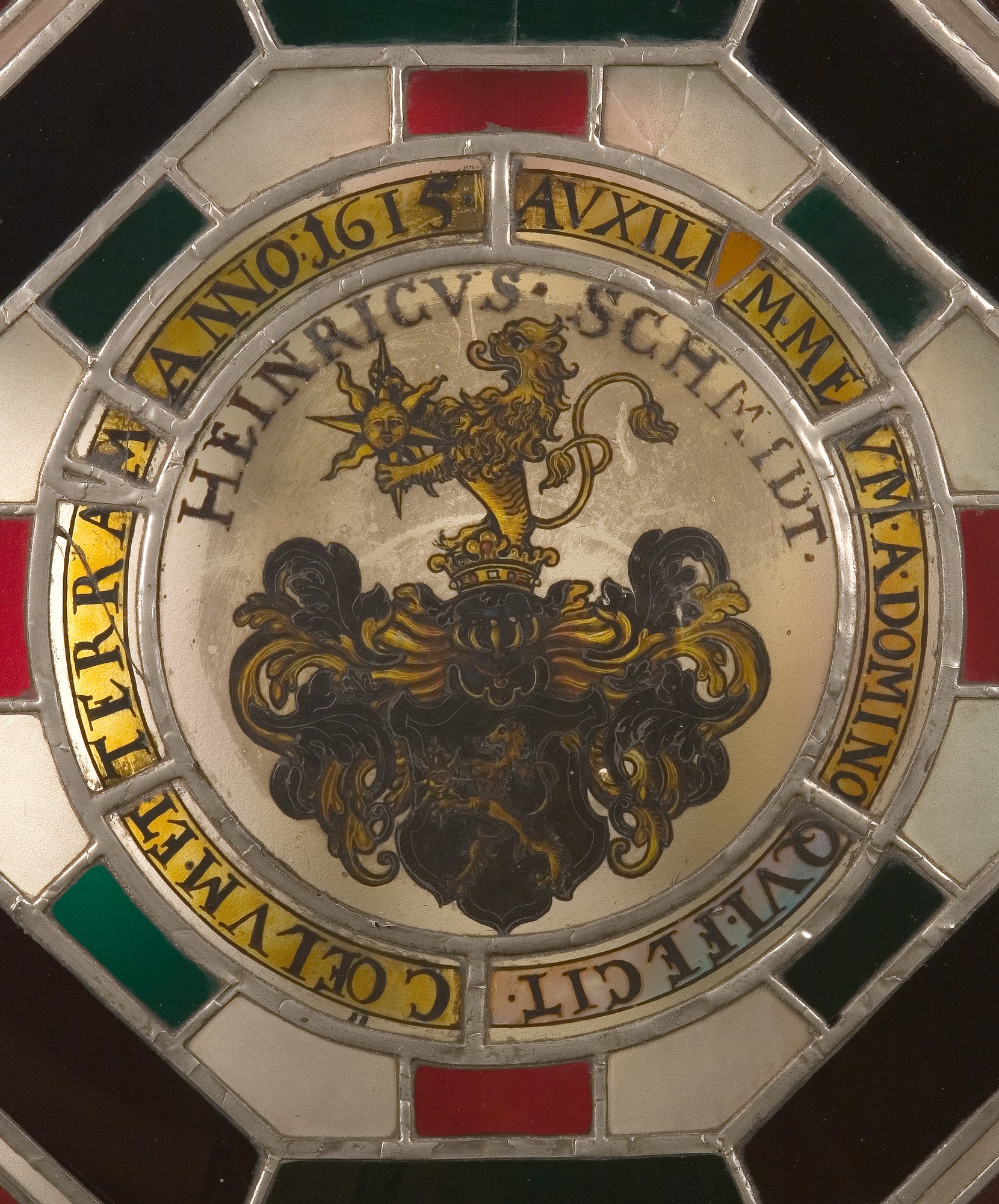 W niemal kwadratowej kwaterze wypełnionej szkłem geometrycznym, złożonym z szybek bez-barwnych oraz kolorowych: czerwonych, zielonych, fioletowych i szafirowych, umieszczony w centrum kolisty witraż herbowy. W tondzie malowany herb von Schmidt z labrami i napisem: HEINRI¬CVS•SCHMIDT. W czarnej tarczy herbowej złoty lew z podwójnym splecionym ogonem, zwrócony w lewo, trzymający w przednich łapach złote promieniste słońce. Nad tarczą hełm prętowy złoto-niebieski z koroną szlachecką trójpałkową, w klejnocie powtórzone godło z tarczy. Labry w formie liści akantowych, czarno-złote. Tondo otoczone wąską żółtą bordiurą z napisem: AV X I L I [ V ] M • M E V M • A •DOMINO QVI•FECIT•CÖELVM•ET•TERRAM ANNO:1615 (Schronieniem moim jest Pan, który stworzył niebo i ziemię – Psalm 120,2).