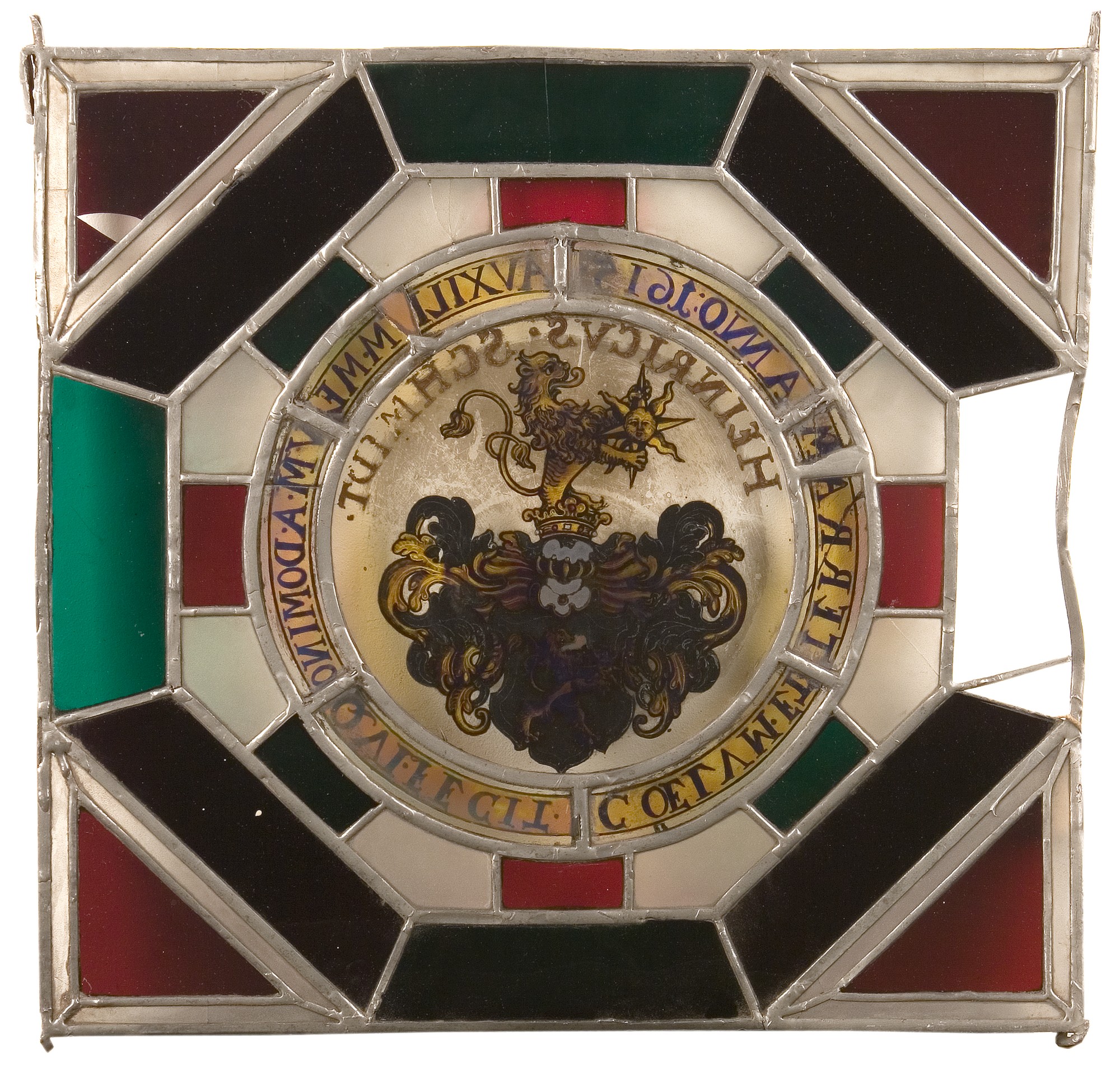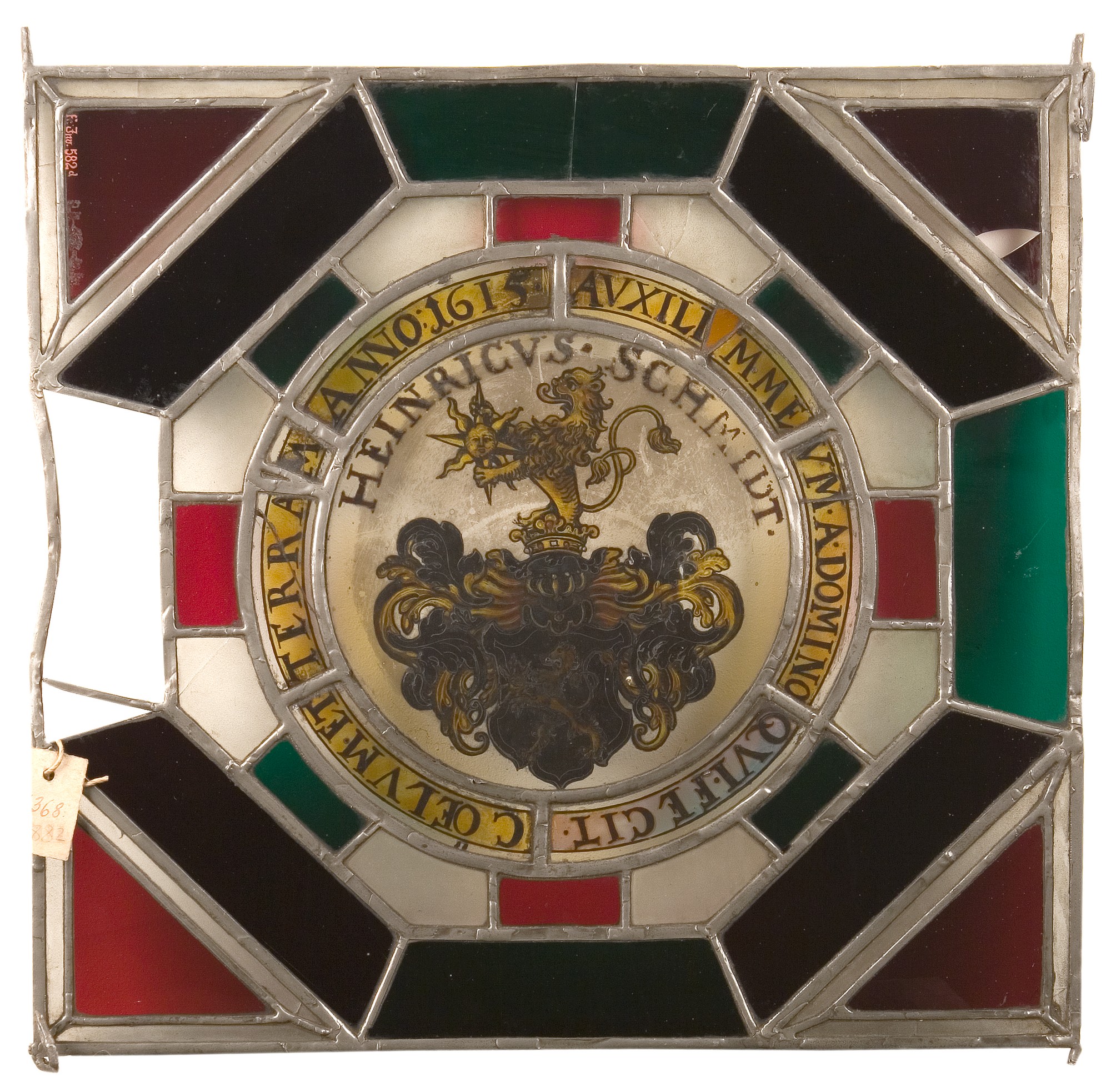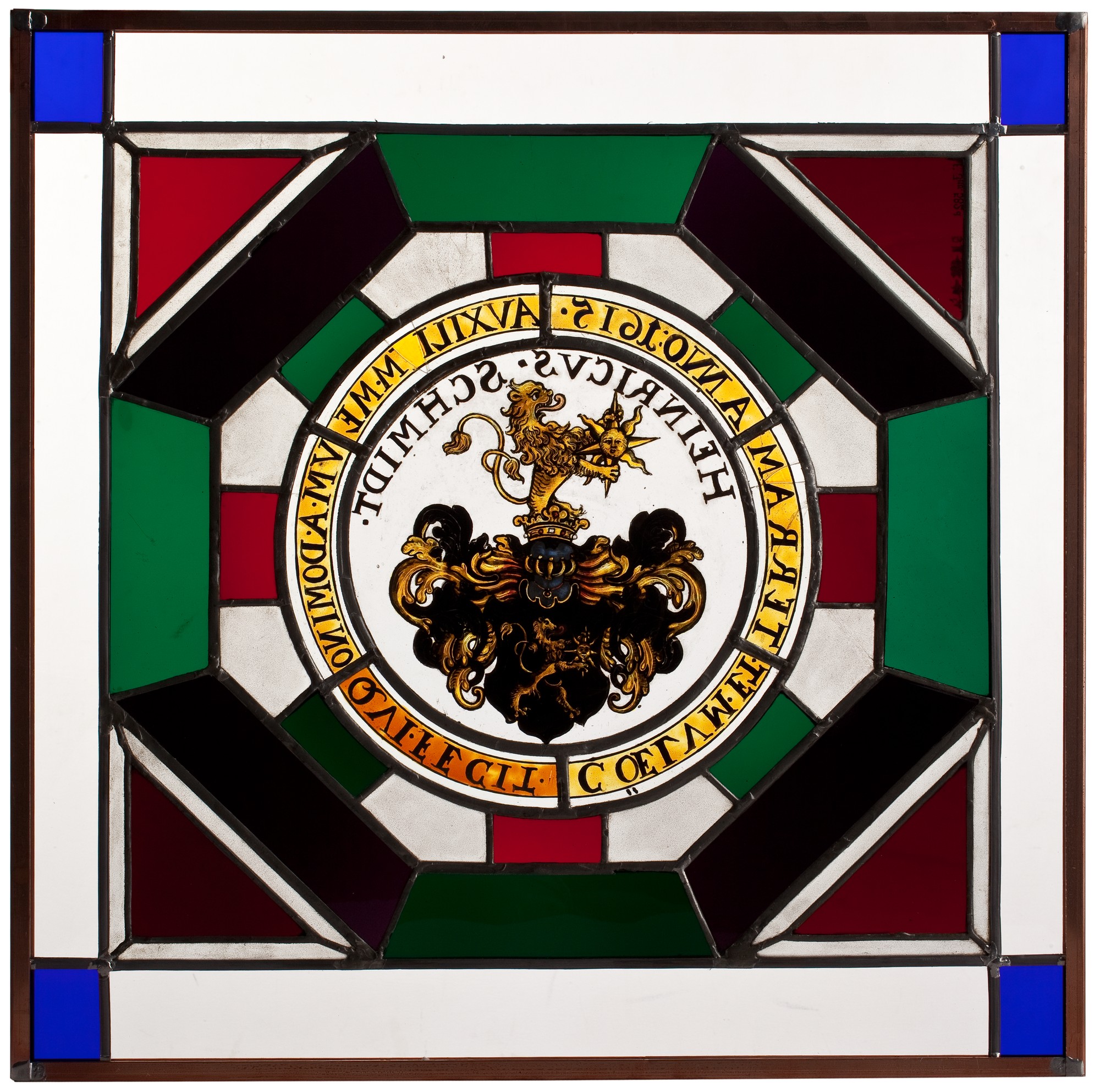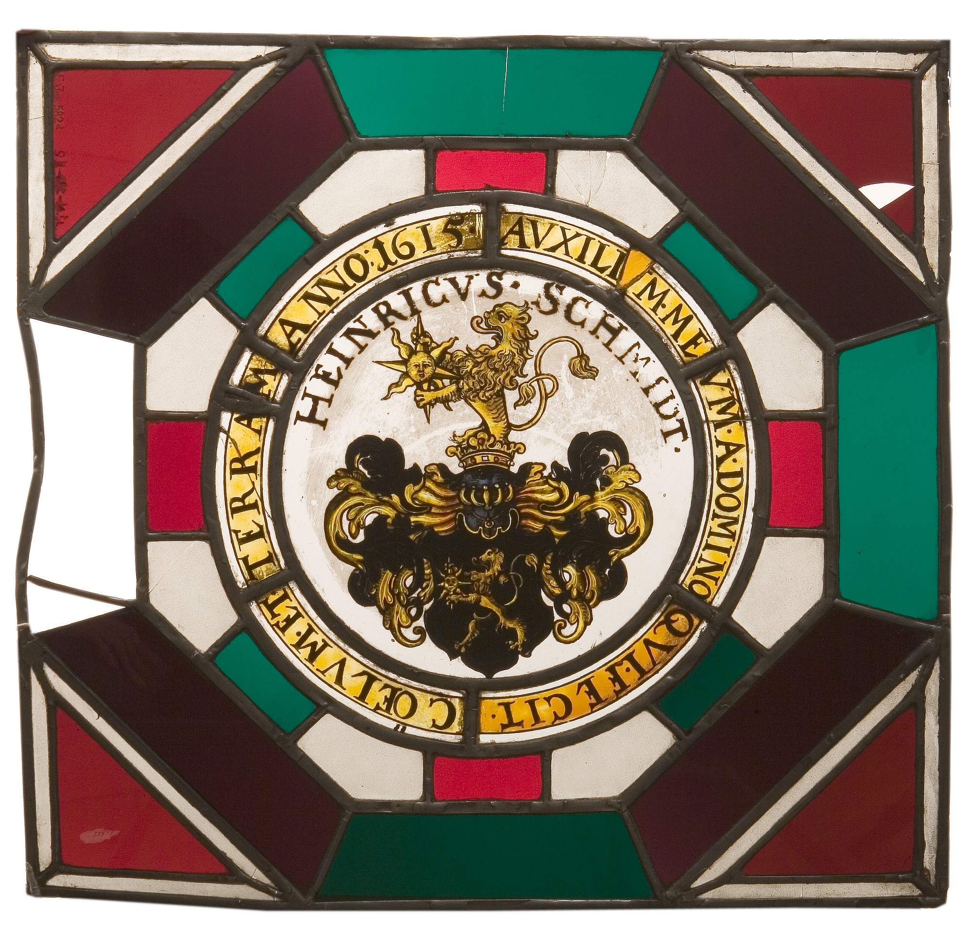 W niemal kwadratowej kwaterze wypełnionej szkłem geometrycznym, złożonym z szybek bez-barwnych oraz kolorowych: czerwonych, zielonych, fioletowych i szafirowych, umieszczony w centrum kolisty witraż herbowy. W tondzie malowany herb von Schmidt z labrami i napisem: HEINRI¬CVS•SCHMIDT. W czarnej tarczy herbowej złoty lew z podwójnym splecionym ogonem, zwrócony w lewo, trzymający w przednich łapach złote promieniste słońce. Nad tarczą hełm prętowy złoto-niebieski z koroną szlachecką trójpałkową, w klejnocie powtórzone godło z tarczy. Labry w formie liści akantowych, czarno-złote. Tondo otoczone wąską żółtą bordiurą z napisem: AV X I L I [ V ] M • M E V M • A •DOMINO QVI•FECIT•CÖELVM•ET•TERRAM ANNO:1615 (Schronieniem moim jest Pan, który stworzył niebo i ziemię – Psalm 120,2).