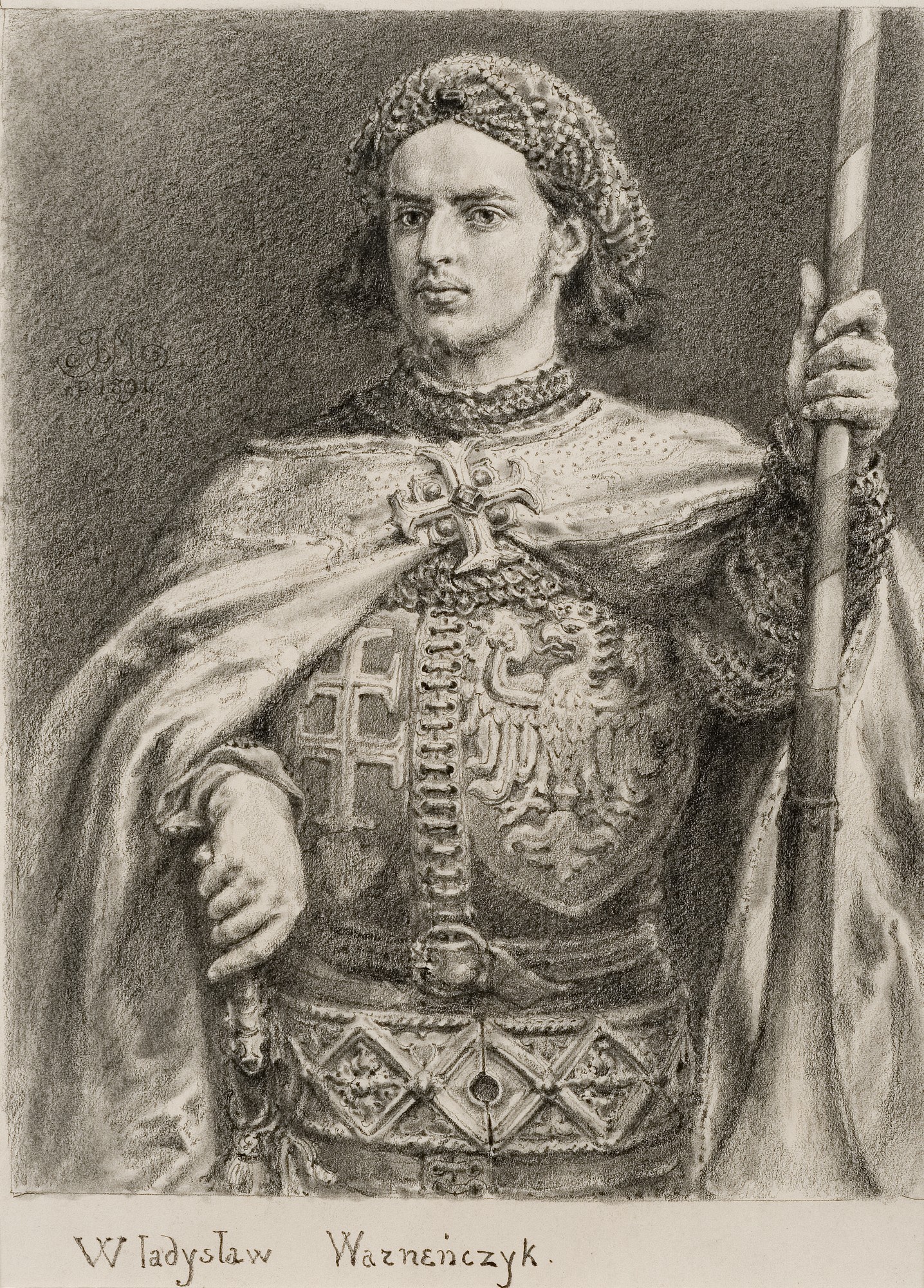 Władysław Warneńczyk swój przydomek zyskał za sprawą bohaterskiej śmierci w bitwie pod Warną. Matejko ukazał władcę jako młodego mężczyznę w napierśniku, na którego płytach widnieje podwójny krzyż – godło Węgier oraz tarcza z polskim orłem w koronie. Natomiast płaszcz władcy został spięty zaponą w kształcie równoramiennego krzyża – symbolizuje on chrześcijaństwo, którego Władysław był obrońcą. Trzymane przez niego atrybuty, takie jak rękojeść miecza oraz kopia, mają za zadanie podkreślić rycerską gotowość króla do walki za wiarę chrześcijańską.