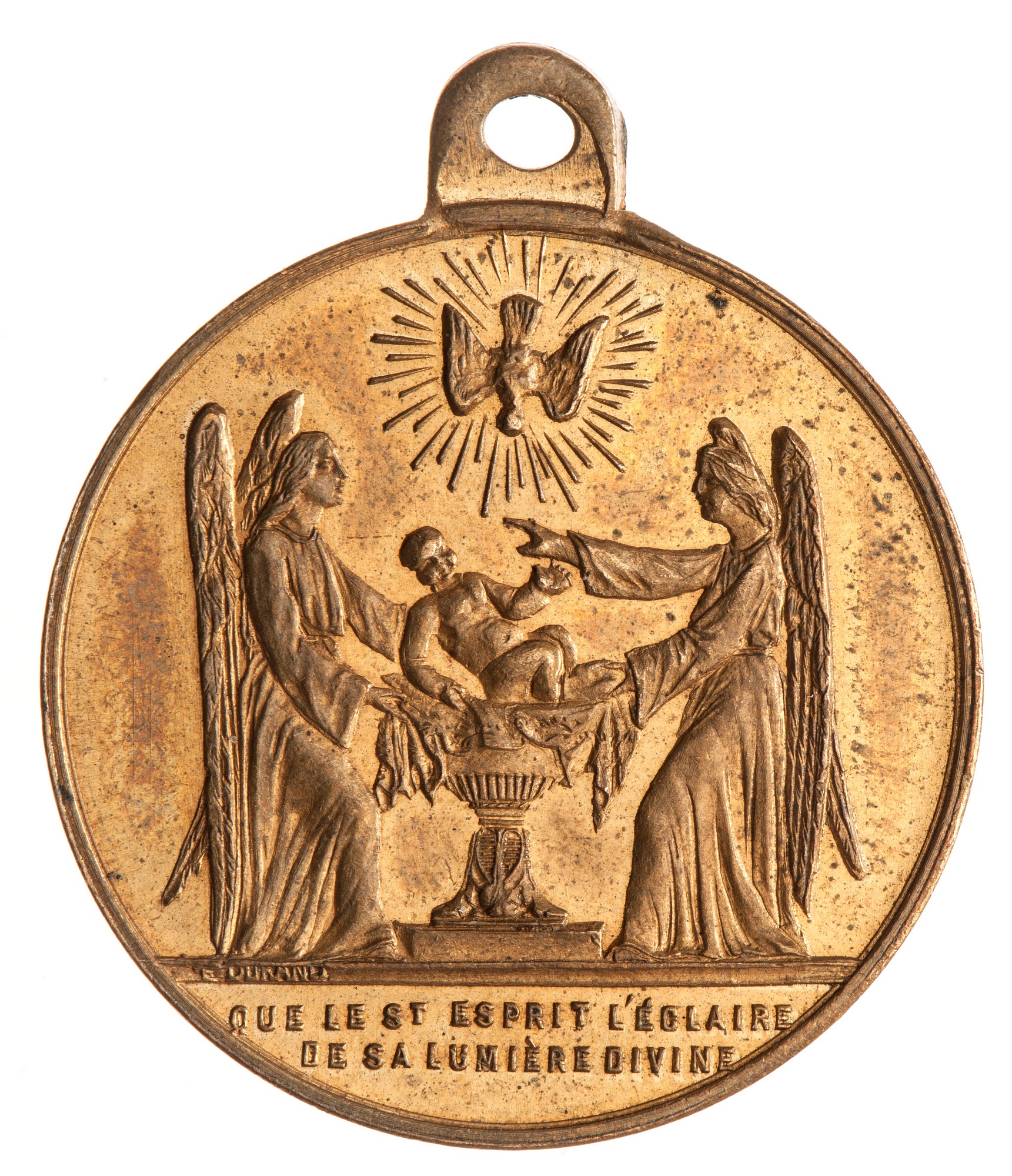 awers: Pośrodku chrzelnica. Nad nią niemowlę trzymane przez dwa anioły. Powyżej Duch Święty w postaci gałębicy, ukazanej wśród promieni. Pod przedstawieniem, po lewej, sygnatura medaliera: E DURAND. Poniżej napis: QUE LE ST ESPRIT L’ÉCLAIRE/ DE SA LUMIERE DIVINE.