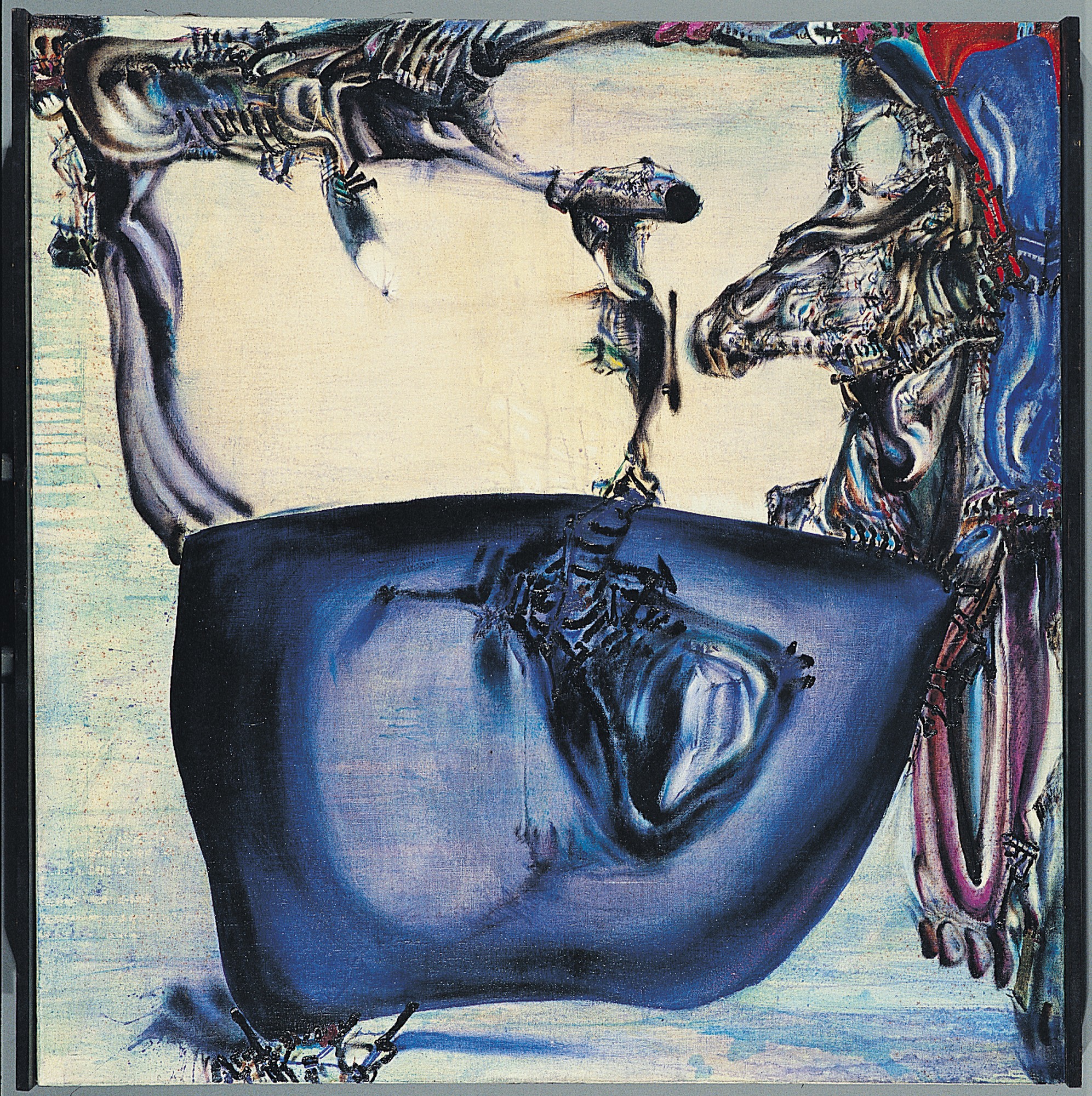 Na biało-błękitnym tle ekspresyjne formy. W dolnej części, centralnie, duży kształt czarno-granatowo-niebieski połączony lewo skos i w pionie z formami przypominającymi tkankę organiczną. Z prawej strony podobnie splątane kształty. Całość w nasyconych błękitach ze smugami czerwieni, fioletow, szarości i czerni.